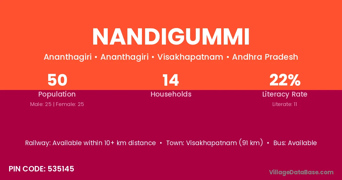 Nandigummi village has a total population of 50 people, of which 25 are males and 25 are females.