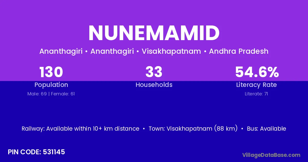 Visakhapatnam (88 km) is the nearest town to Nunemamid village for major economic activities and is located approximately 88 km away.