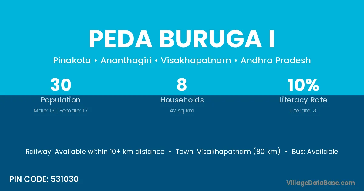 Peda Buruga I village has a total population of 30 people, of which 13 are males and 17 are females.