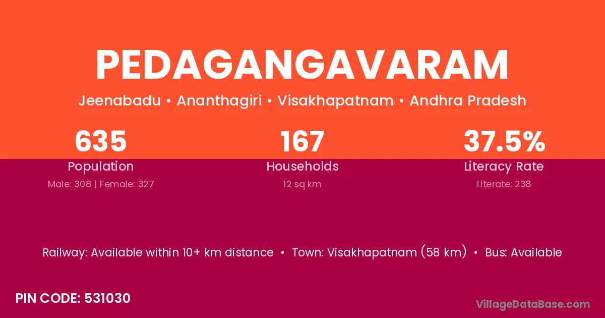 Visakhapatnam (58 km) is the nearest town to Pedagangavaram village for major economic activities and is located approximately 58 km away.