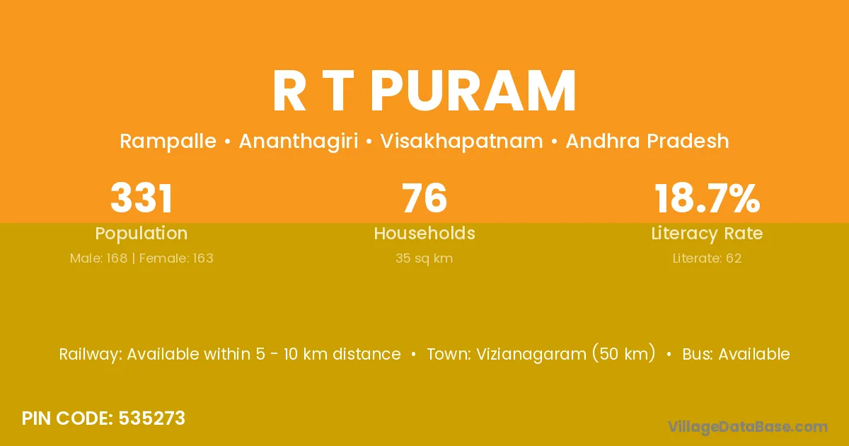 Vizianagaram (50 km) is the nearest town to R T Puram village for major economic activities and is located approximately 50 km away.