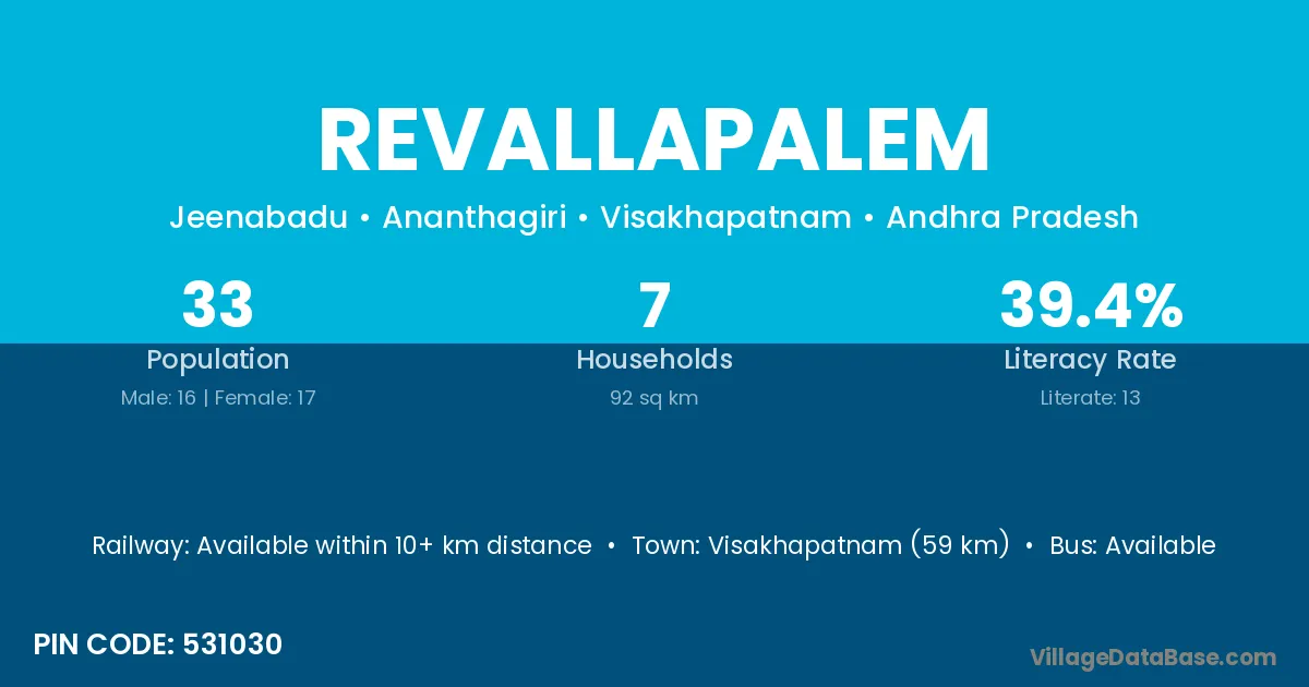 Revallapalem village has a total population of 33 people, of which 16 are males and 17 are females.