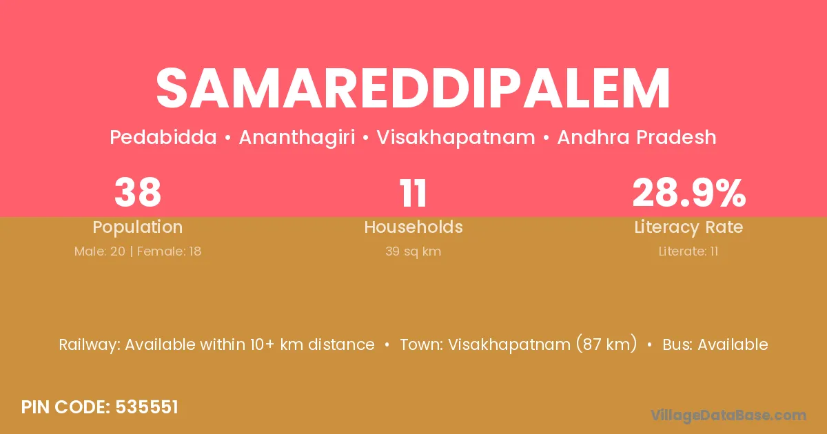 Samareddipalem village has a total population of 38 people, of which 20 are males and 18 are females.