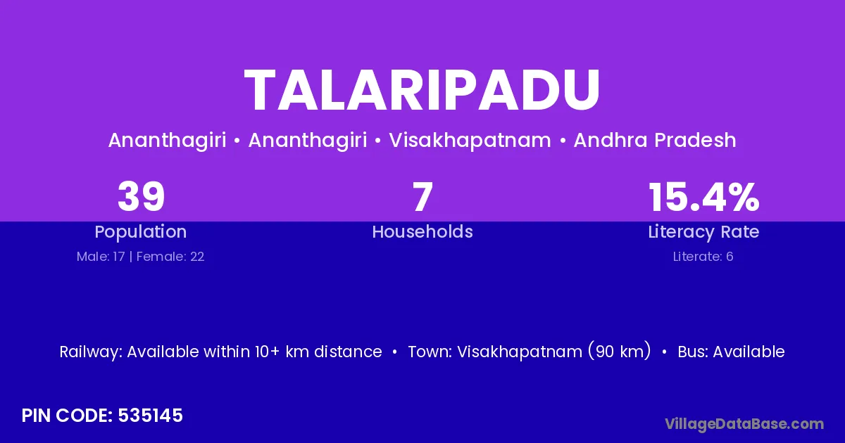 Talaripadu village has a total population of 39 people, of which 17 are males and 22 are females.