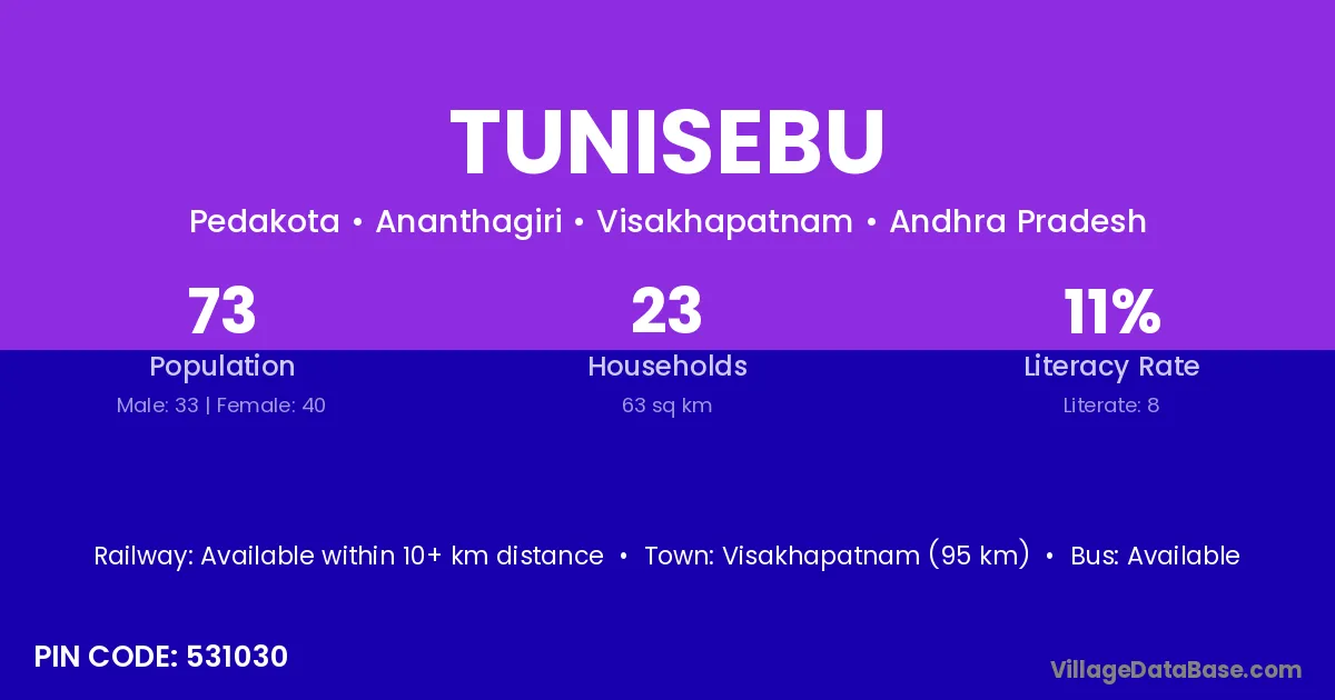 Visakhapatnam (95 km) is the nearest town to Tunisebu village for major economic activities and is located approximately 95 km away.