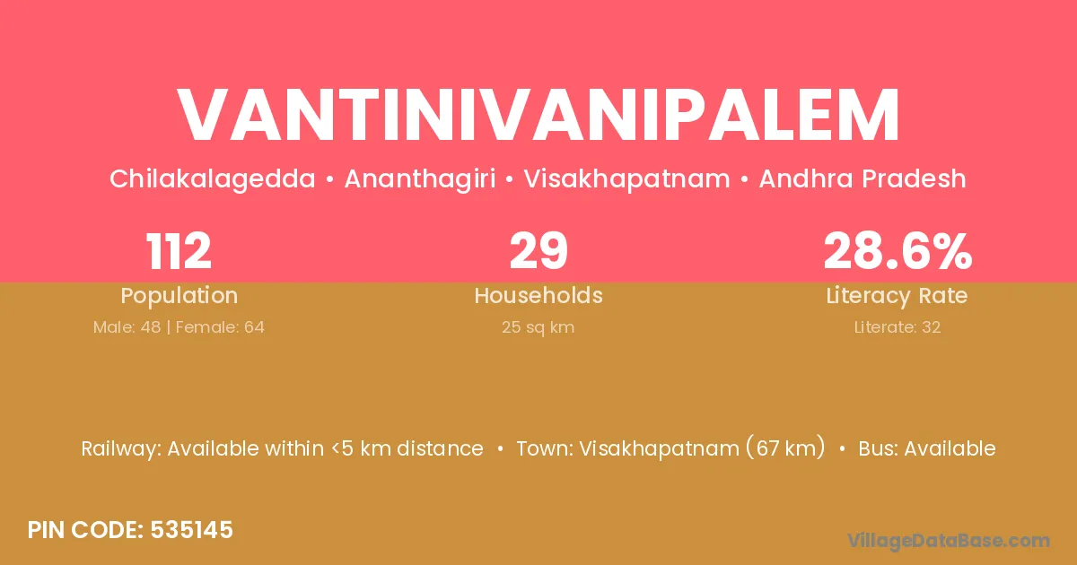 Vantinivanipalem village has a total population of 112 people, of which 48 are males and 64 are females.