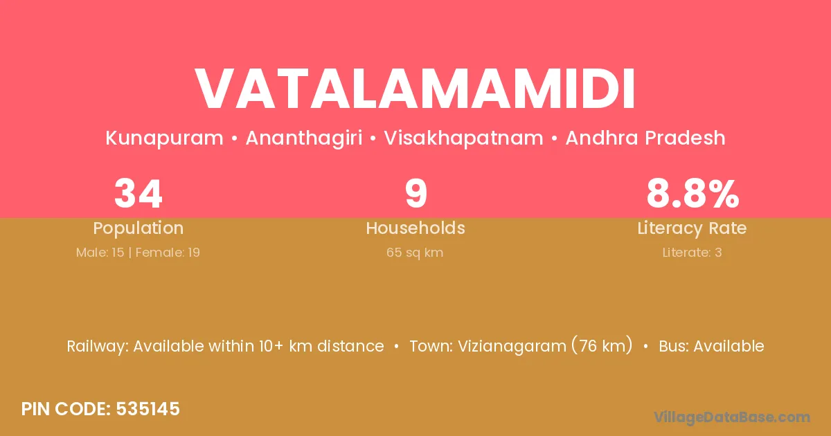 Vatalamamidi village has a total population of 34 people, of which 15 are males and 19 are females.