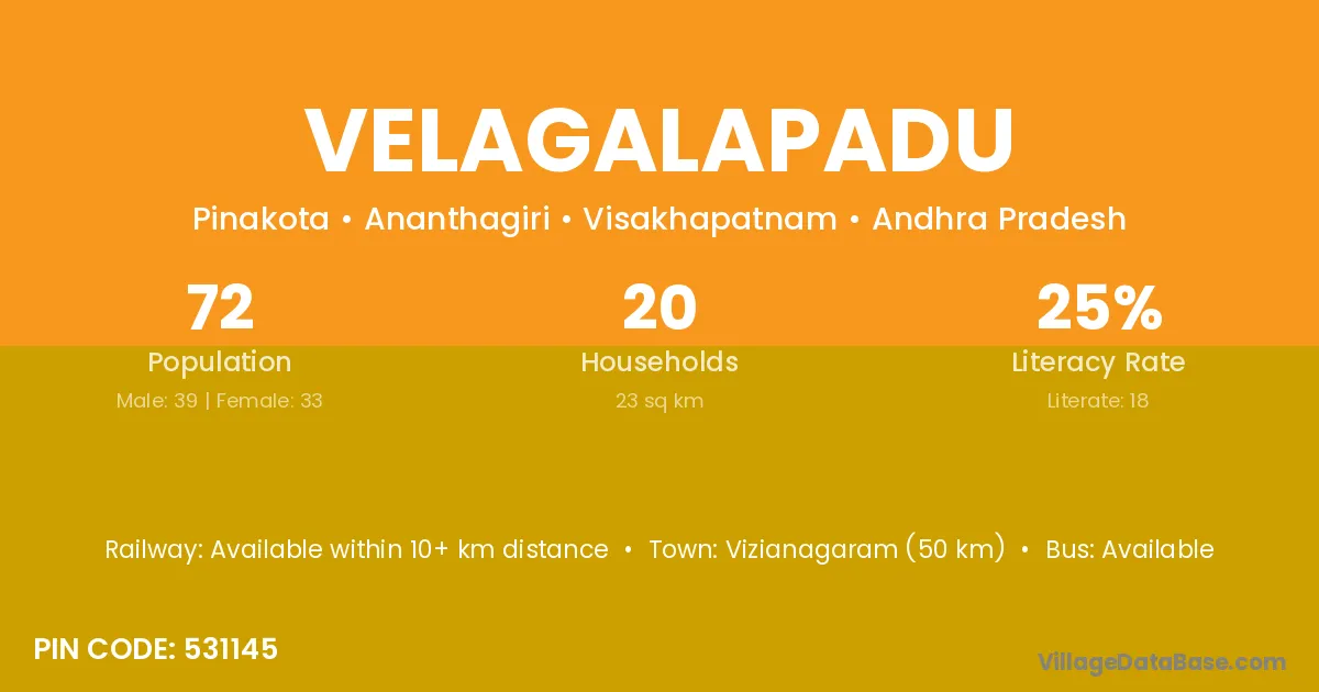 Velagalapadu village has a total population of 72 people, of which 39 are males and 33 are females.
