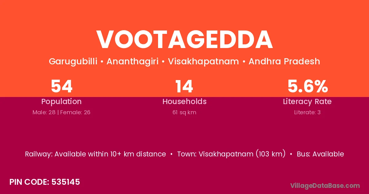 The literacy rate of Vootagedda village is 5.56%. Male literacy stands at 10.71% and female literacy at 0.00%.