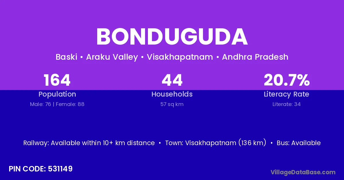 Visakhapatnam (136 km) is the nearest town to Bonduguda village for major economic activities and is located approximately 136 km away.