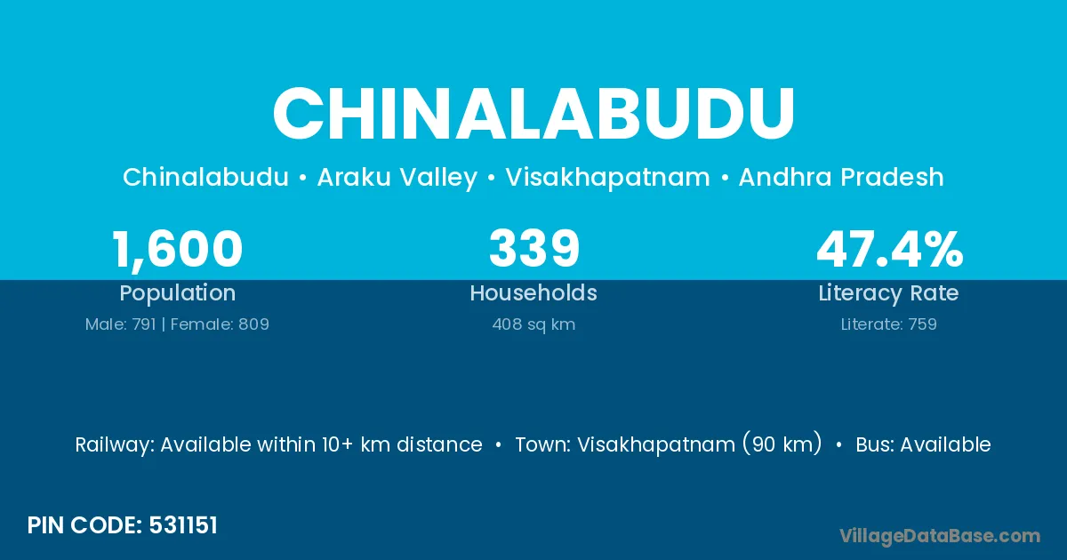 Visakhapatnam (90 km) is the nearest town to Chinalabudu village for major economic activities and is located approximately 90 km away.
