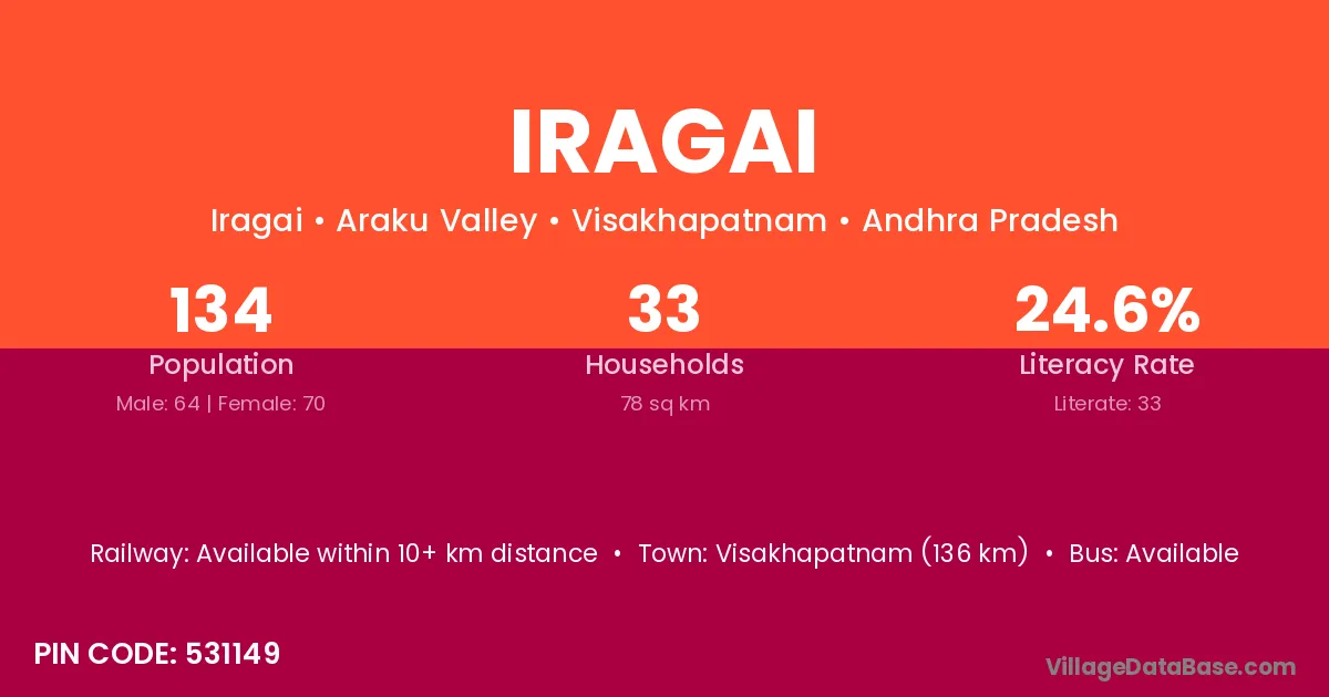 Iragai village has a total population of 134 people, of which 64 are males and 70 are females.