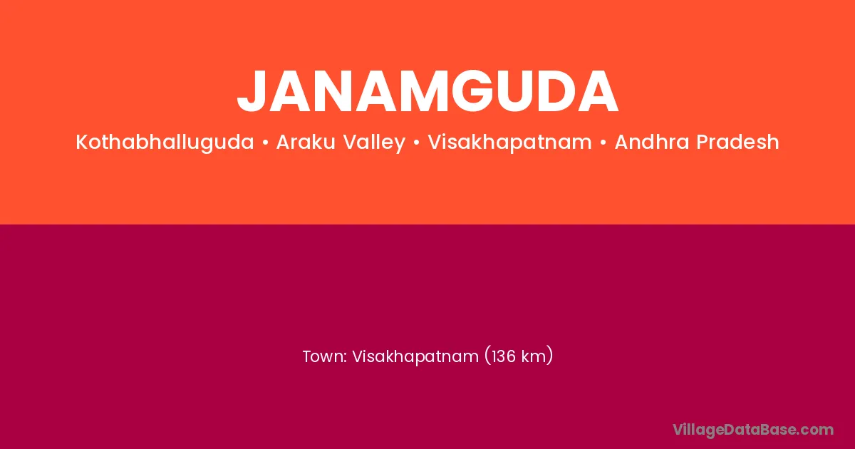 Visakhapatnam (136 km) is the nearest town to Janamguda village for major economic activities and is located approximately 136 km away.