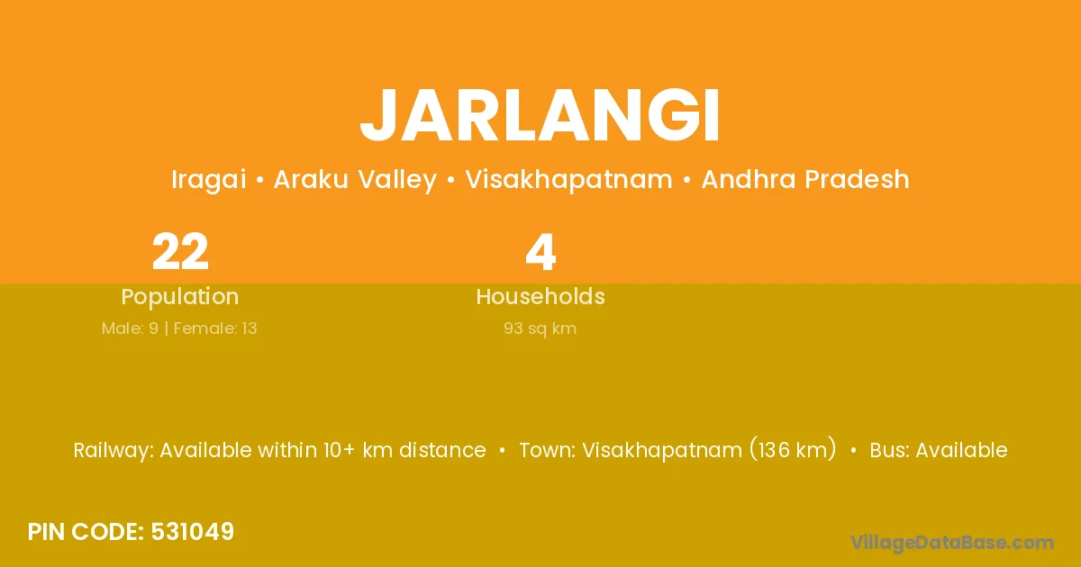 Visakhapatnam (136 km) is the nearest town to Jarlangi village for major economic activities and is located approximately 136 km away.