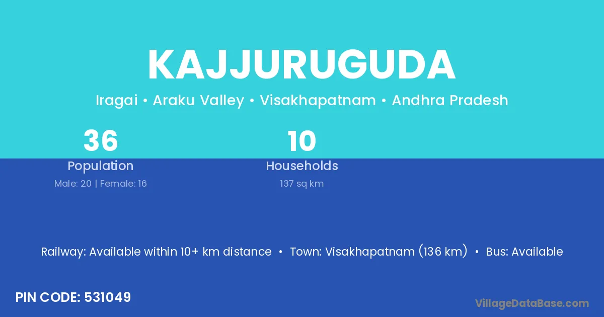 Visakhapatnam (136 km) is the nearest town to Kajjuruguda village for major economic activities and is located approximately 136 km away.