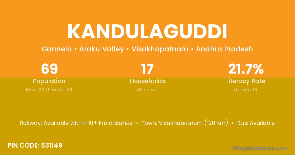 Kandulaguddi village has a total population of 69 people, of which 33 are males and 36 are females.