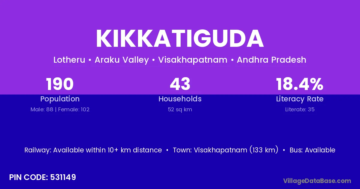 The literacy rate of Kikkatiguda village is 18.42%. Male literacy stands at 29.55% and female literacy at 8.82%.
