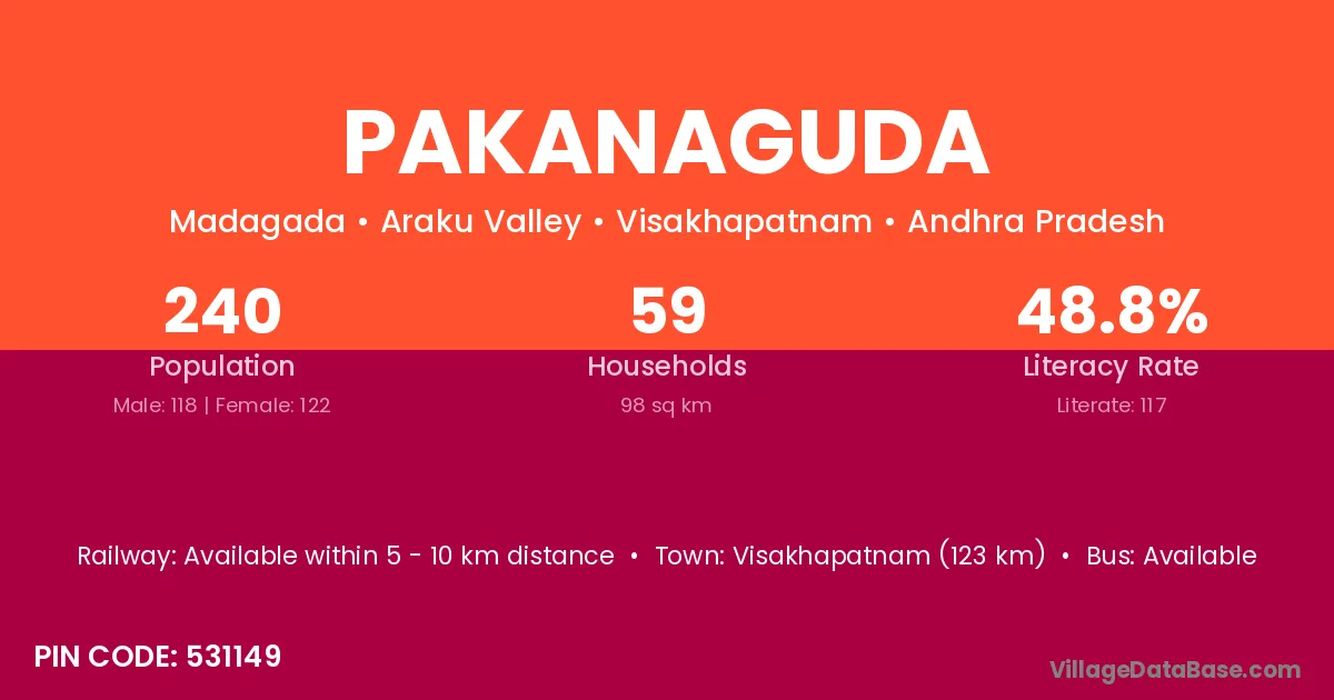 Visakhapatnam (123 km) is the nearest town to Pakanaguda village for major economic activities and is located approximately 123 km away.