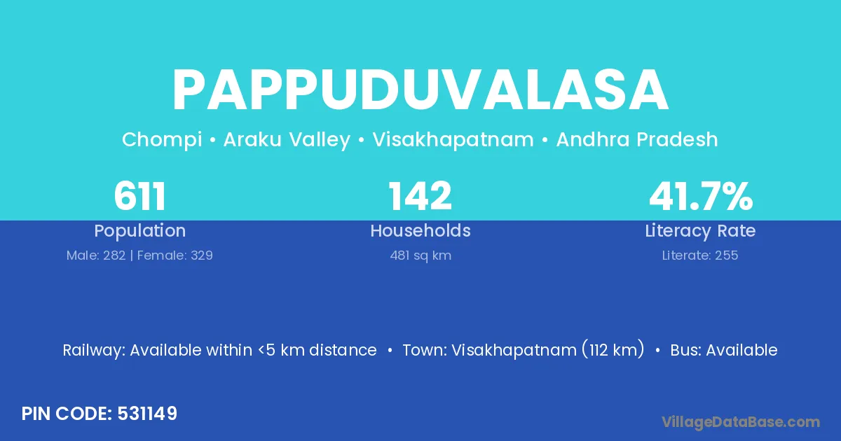 Pappuduvalasa village has a total population of 611 people, of which 282 are males and 329 are females.
