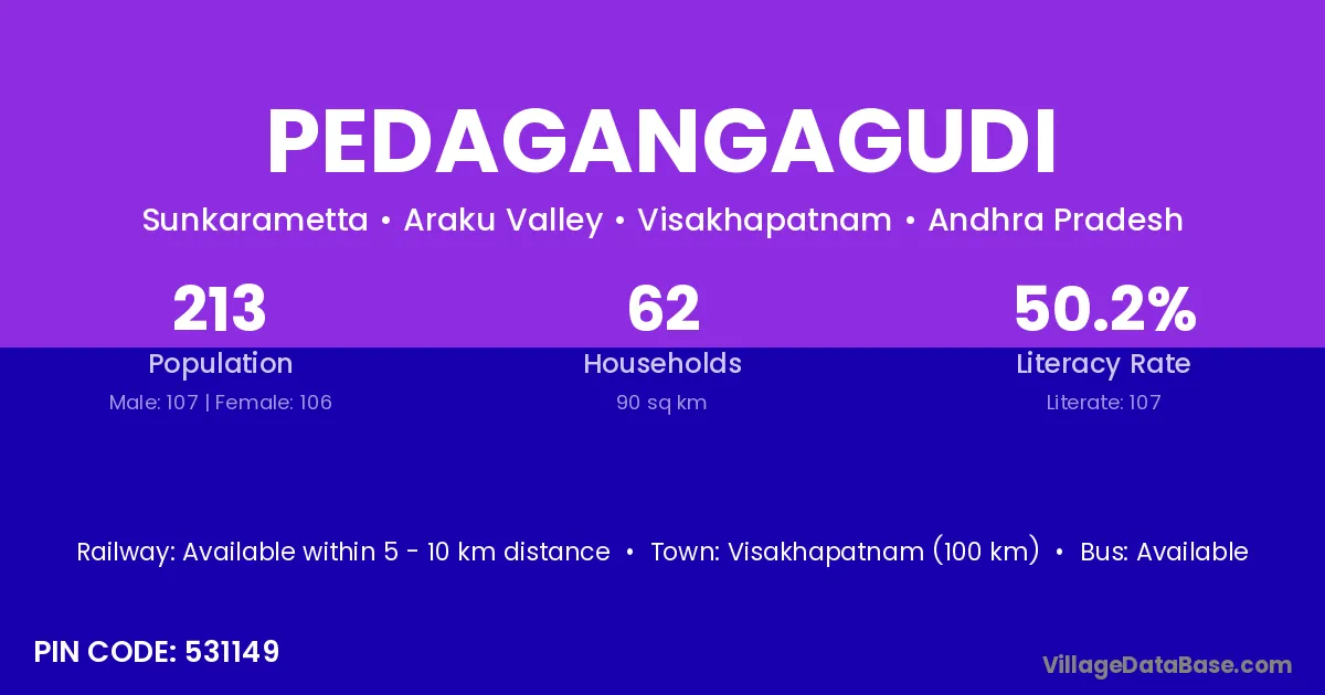 Visakhapatnam (100 km) is the nearest town to Pedagangagudi village for major economic activities and is located approximately 100 km away.