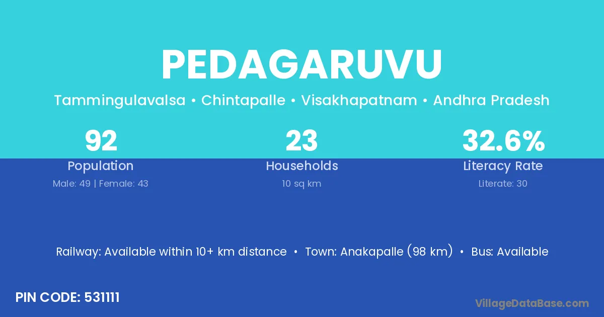 Pedagaruvu village has a total population of 28 people, of which 15 are males and 13 are females.