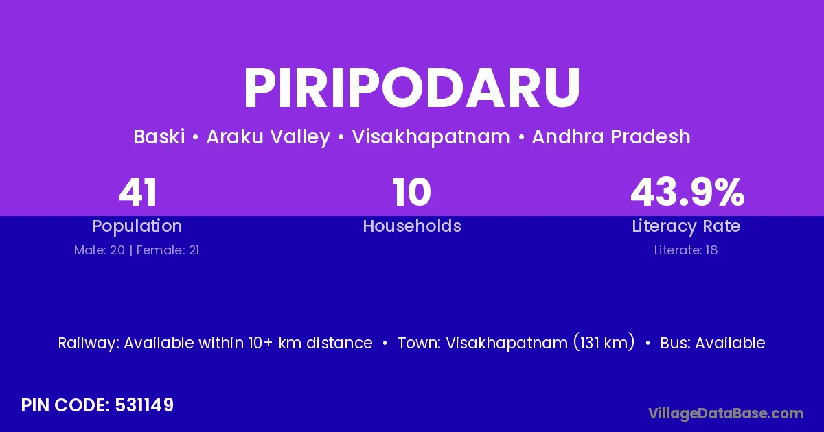 Visakhapatnam (131 km) is the nearest town to Piripodaru village for major economic activities and is located approximately 131 km away.