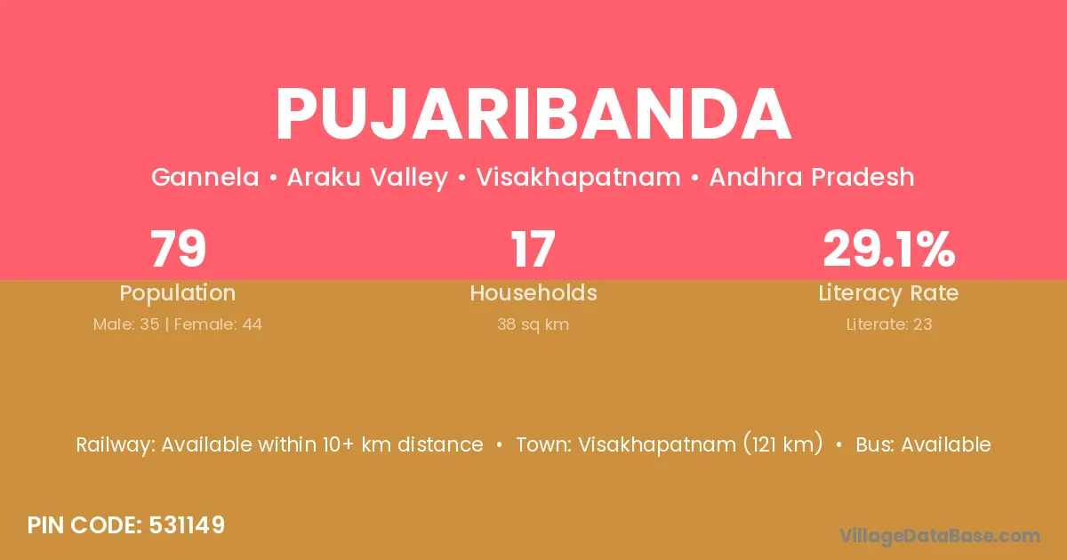 Visakhapatnam (121 km) is the nearest town to Pujaribanda village for major economic activities and is located approximately 121 km away.