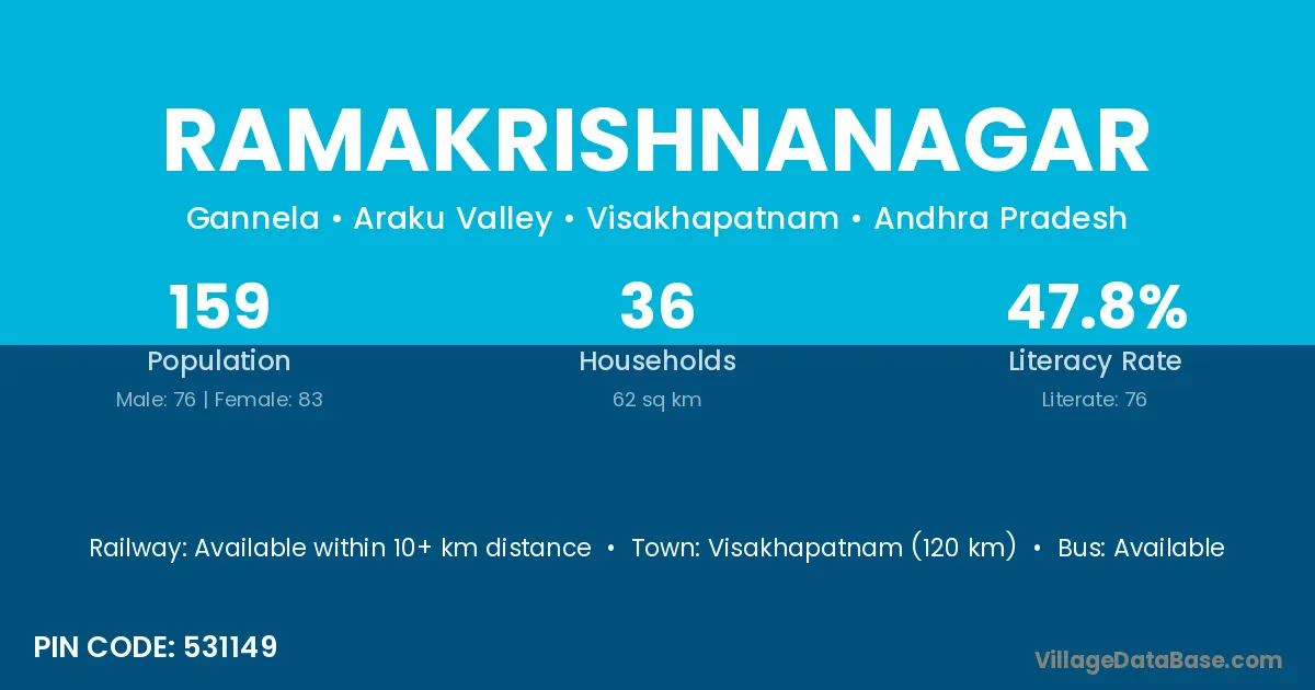 Visakhapatnam (120 km) is the nearest town to Ramakrishnanagar village for major economic activities and is located approximately 120 km away.
