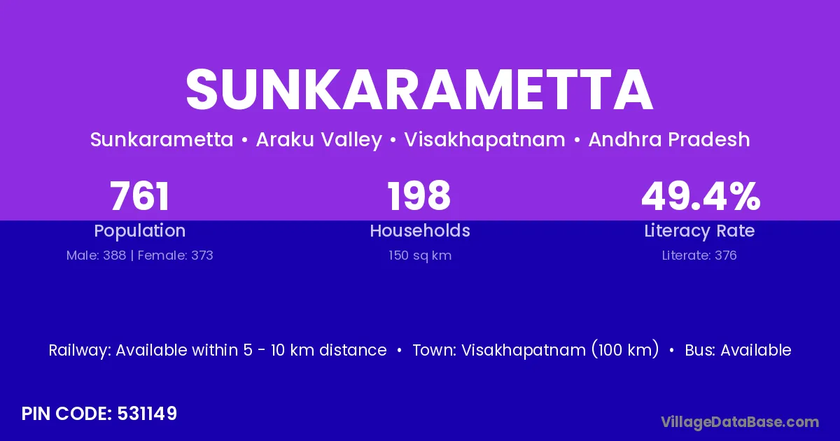 Sunkarametta village has a total population of 761 people, of which 388 are males and 373 are females.