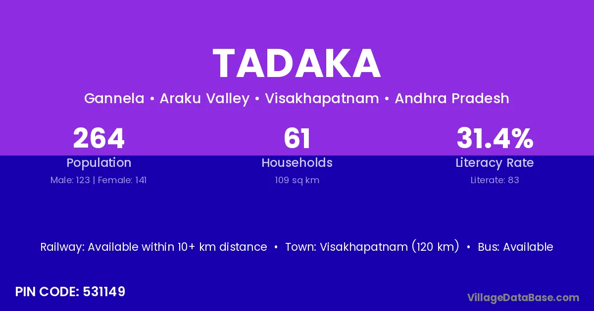 Visakhapatnam (120 km) is the nearest town to Tadaka village for major economic activities and is located approximately 120 km away.