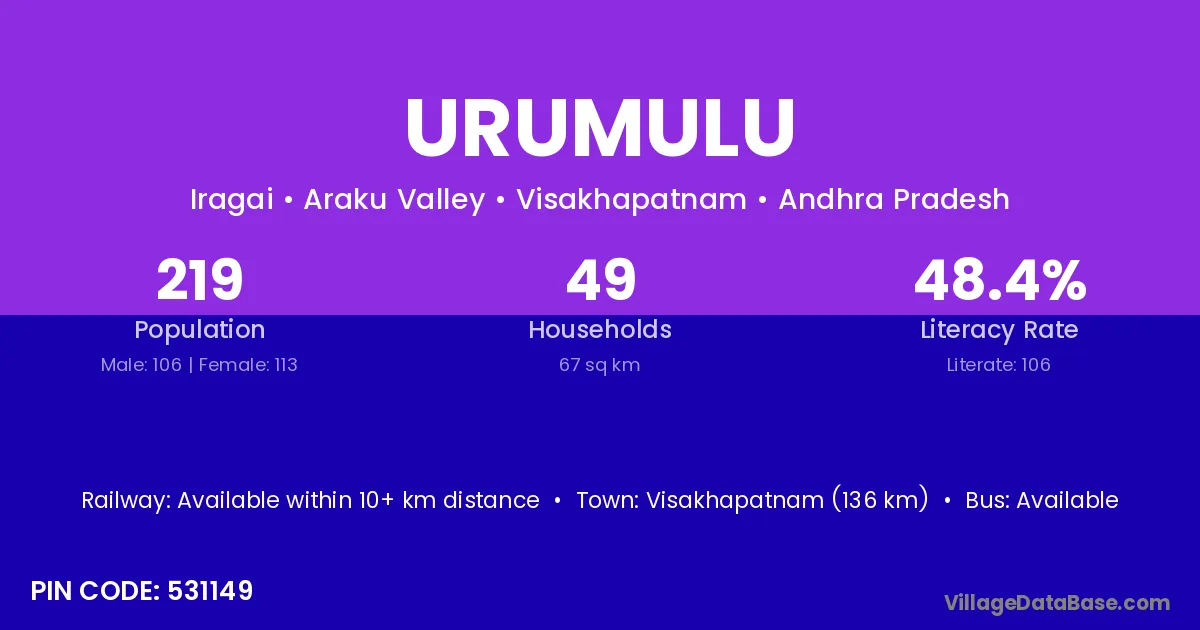 Urumulu village has a total population of 219 people, of which 106 are males and 113 are females.