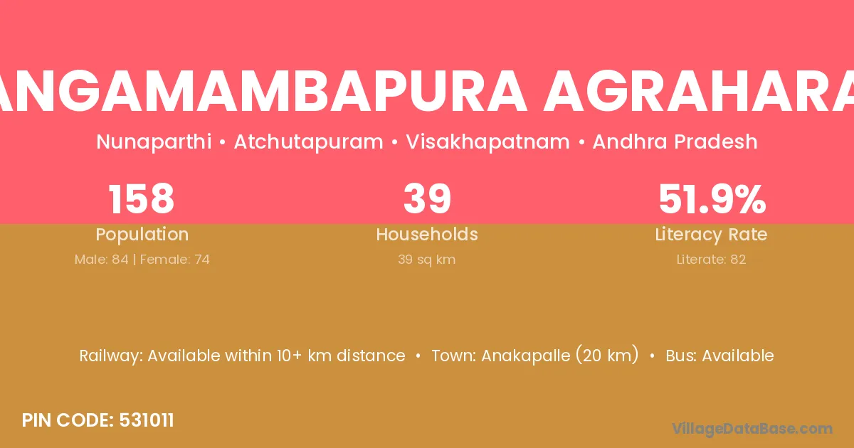 Anakapalle (20 km) is the nearest town to Gangamambapura Agraharam village for major economic activities and is located approximately 20 km away.