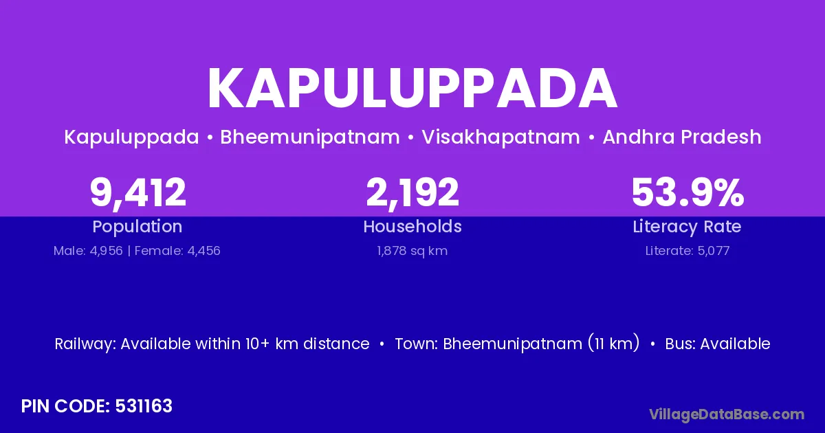 Bheemunipatnam (11 km) is the nearest town to Kapuluppada village for major economic activities and is located approximately 11 km away.