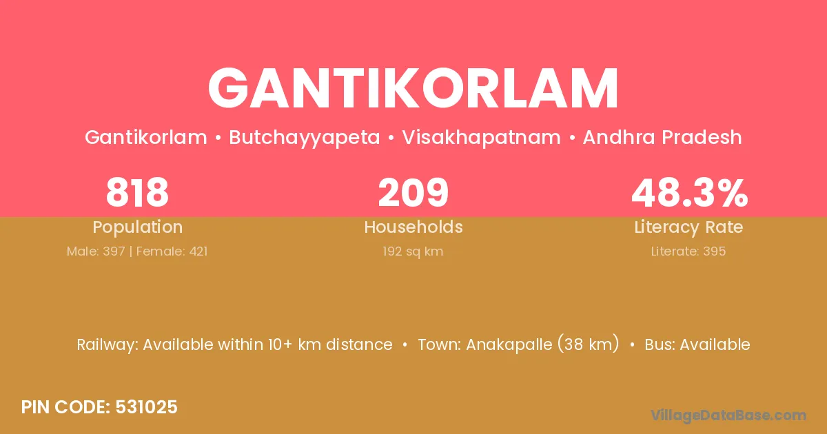 Gantikorlam village has a total population of 818 people, of which 397 are males and 421 are females.