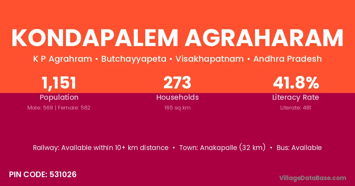Anakapalle (32 km) is the nearest town to Kondapalem Agraharam village for major economic activities and is located approximately 32 km away.