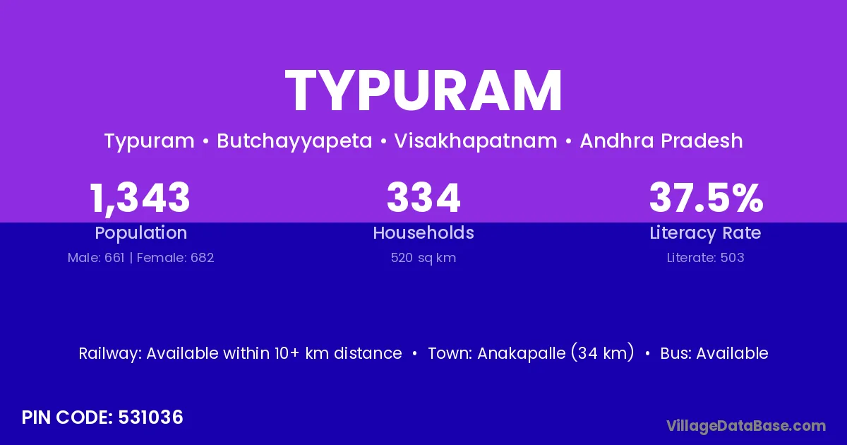 Anakapalle (34 km) is the nearest town to Typuram village for major economic activities and is located approximately 34 km away.
