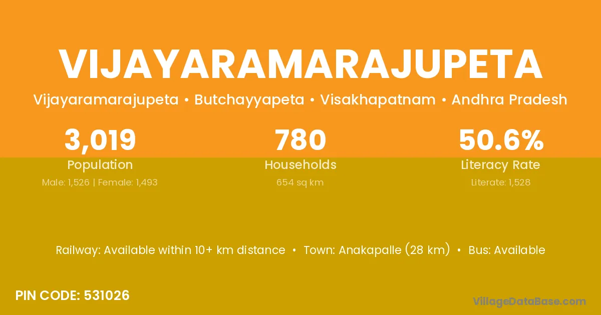 Vijayaramarajupeta village has a total population of 3,019 people, of which 1,526 are males and 1,493 are females.