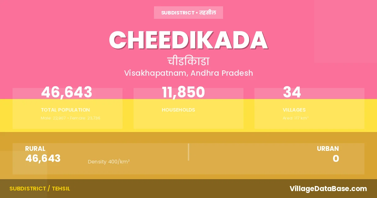 According to the 2011 census The total area of Cheedikada Mandal is 117 km², with a population of 46643 people. The population density is 400 inhabitants per square kilometre, and there are approximately 11850 houses in the sub district.
