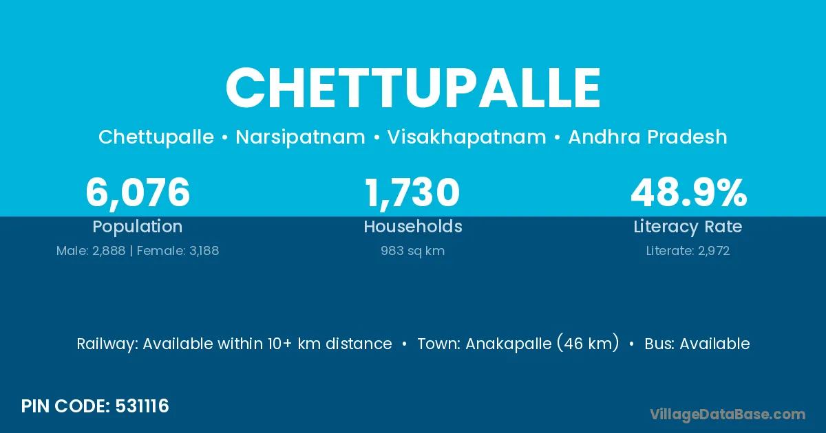 Anakapalle (28 km) is the nearest town to Chettupalle village for major economic activities and is located approximately 28 km away.