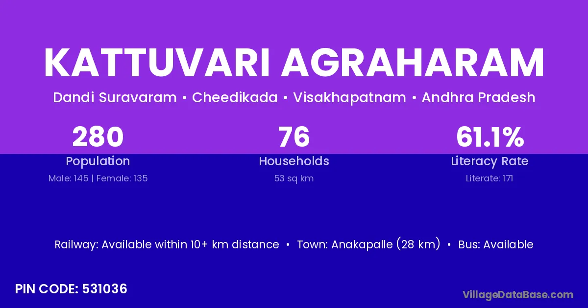 Anakapalle (28 km) is the nearest town to Kattuvari Agraharam village for major economic activities and is located approximately 28 km away.