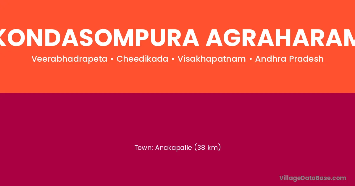 Anakapalle (38 km) is the nearest town to Kondasompura Agraharam village for major economic activities and is located approximately 38 km away.