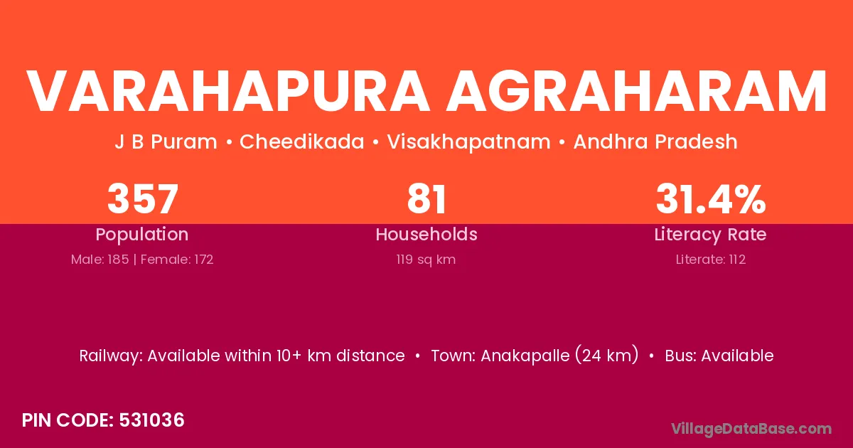 Anakapalle (24 km) is the nearest town to Varahapura Agraharam village for major economic activities and is located approximately 24 km away.