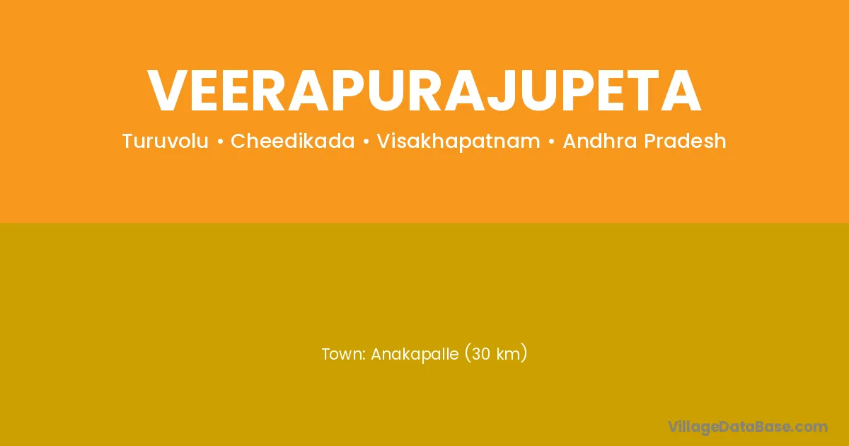 Anakapalle (30 km) is the nearest town to Veerapurajupeta village for major economic activities and is located approximately 30 km away.