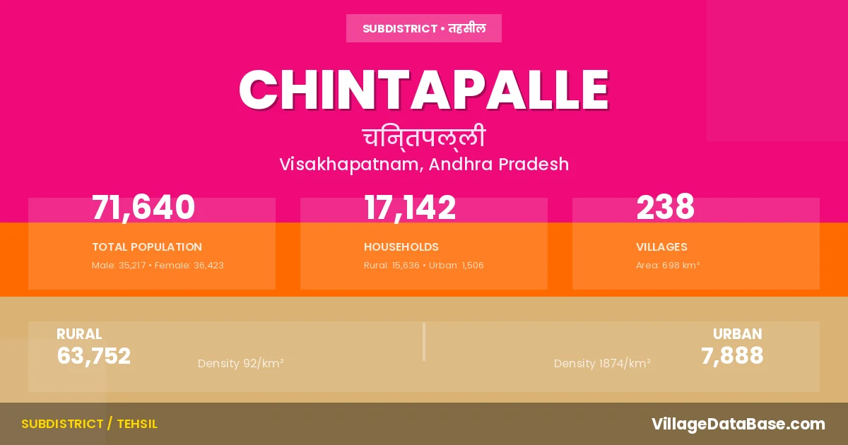 According to the 2011 census The total area of Chintapalle Mandal is 698 km², with a population of 71640 people. The population density is 103 inhabitants per square kilometre, and there are approximately 17142 houses in the sub district.