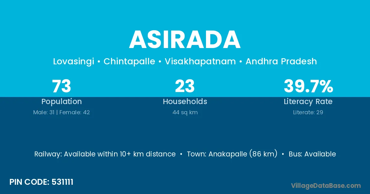 Anakapalle (86 km) is the nearest town to Asirada village for major economic activities and is located approximately 86 km away.