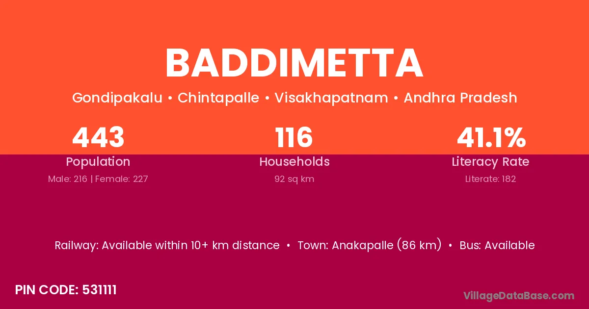 Baddimetta village has a total population of 443 people, of which 216 are males and 227 are females.