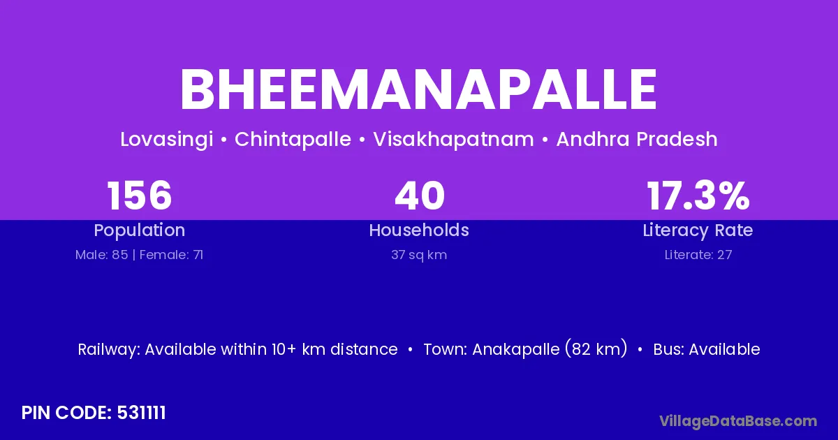 Bheemanapalle village has a total population of 156 people, of which 85 are males and 71 are females.