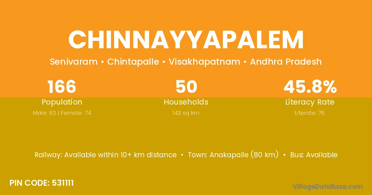Chinnayyapalem village has a total population of 166 people, of which 92 are males and 74 are females.