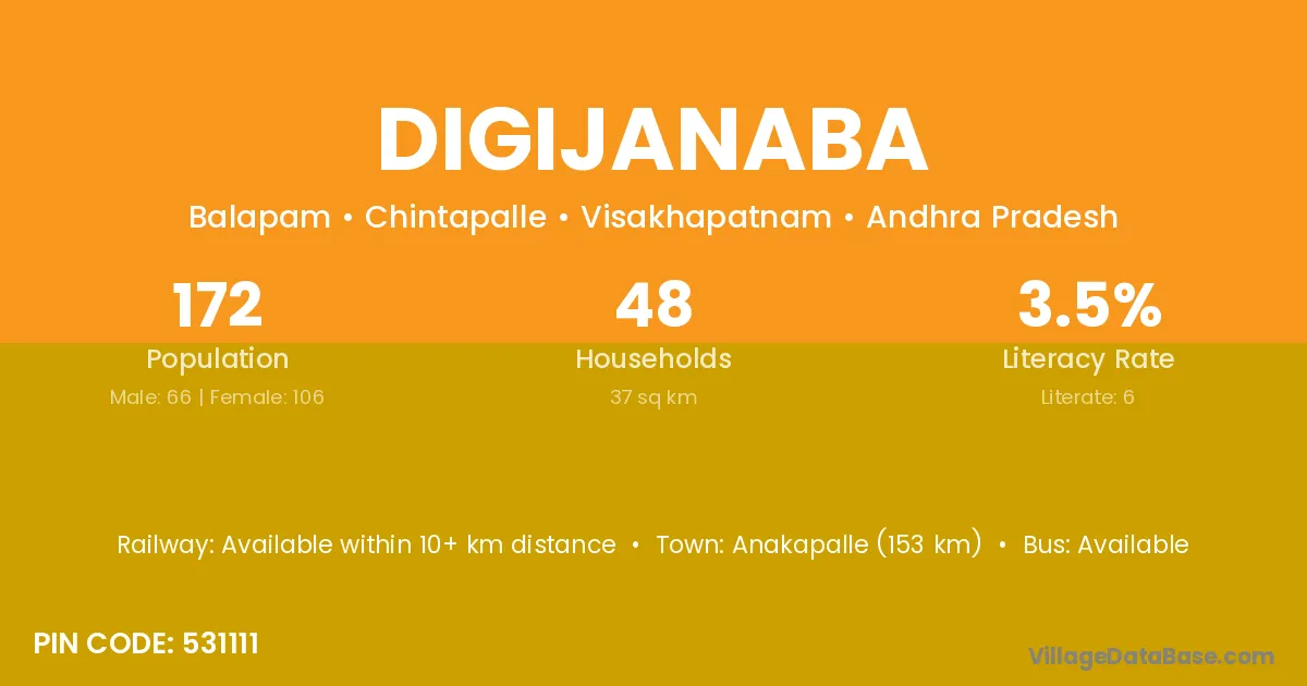 Anakapalle (153 km) is the nearest town to Digijanaba village for major economic activities and is located approximately 153 km away.
