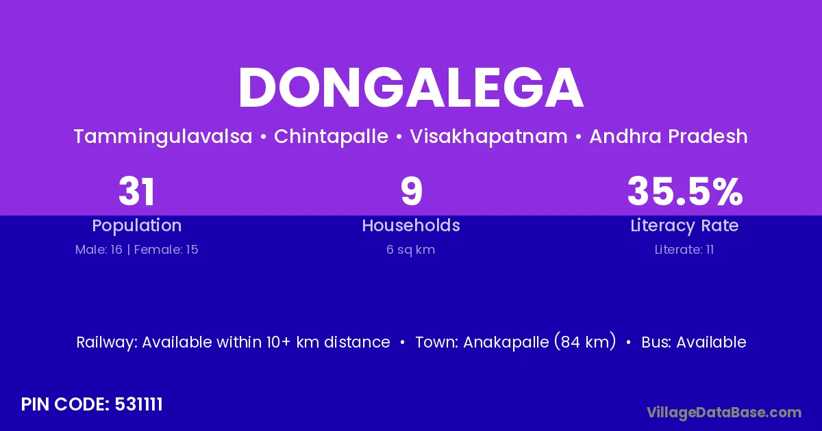 Anakapalle (84 km) is the nearest town to Dongalega village for major economic activities and is located approximately 84 km away.